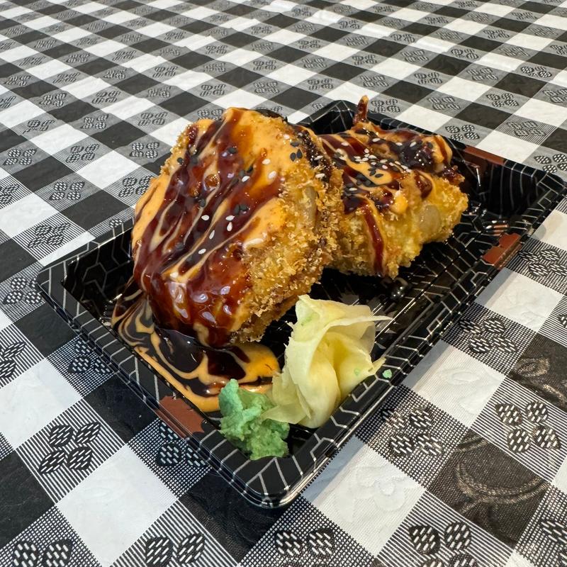 Deep fried 3 shrimp, 2 zucchini, 2 onions, 2 sweet potato and 2 broccoli.